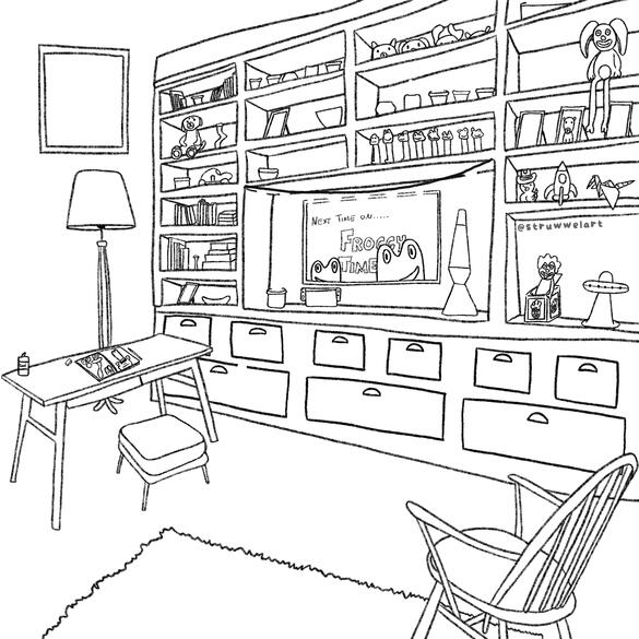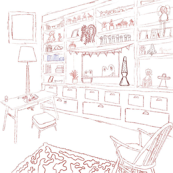 The sketching phase was pretty laid back, I started with a rough outline and kept adding the details as they popped into my head. It was all about having fun and adding in things as I imagined them. I took inspiration from my own shelf of collectibles and other things at home, but also added a lot of random things I thought would look nice or silly.