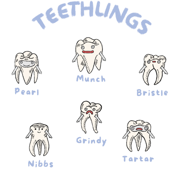 Meet the Teethlings:Pearl – The shiniest of the bunch, Pearl takes great pride in staying spotless. Always polished, always picture-perfect, they dream of starring in a toothpaste commercial.Munch – The laid-back wisdom tooth that shows up late and takes life at their own pace. They claim to be full of wisdom, but mostly just love snacking and napping.Bristle – A walking, talking hygiene lecture. Always reminding the others to brush and floss, Bristle takes dental care very seriously. Probably carries a tiny toothbrush at all times.Nibbs – A quiet and gentle soul, Nibbs is the shyest of the Teethlings. Rather than talking much, he expresses himself through thoughtful little gifts—whether it’s a shiny pebble, a ribbon, or a neatly wrapped candy (approved by Bristle, of course).Grindy – The anxious one of the group, Grindy tends to overthink everything… and grinds their teeth when stressed. They could probably use a mouthguard and a hug.Tartar – A mischievous troublemaker with a love for all things sugary. Always sneaking around with candy and avoiding Bristle at all costs. Deep down, they probably want to be a better tooth… maybe.
